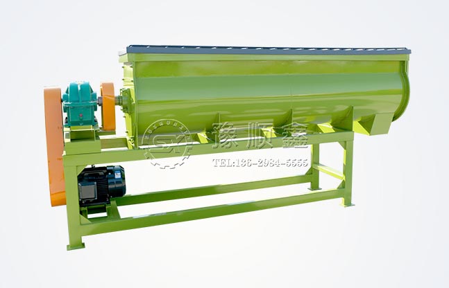 单轴连续搅拌机,它适用于掺混肥粉体的连续搅拌,一般在自动配料设备以后。其工作原理是物料进入搅拌槽内,通过一组双螺带形式的螺旋叶片,进行均匀搅拌,并进入下一道造粒等工序。